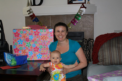 The cuteness factor is now in overload. Charlotte can now sit up on her own without tipping and just plays and plays and plays with her toys. Her favorite toy right now is the shape blocks and box that the Easter Bunny brought for her. The blocks are the perfect size for her little hands and one of them is always sticking them in her mouth. She likes to knock over the tower of blocks we build and she also will "bang" the blocks together with one in each hand. It is so cute. She also really likes her bouncer and is getting more into playing with the toys on it as well as bouncing.